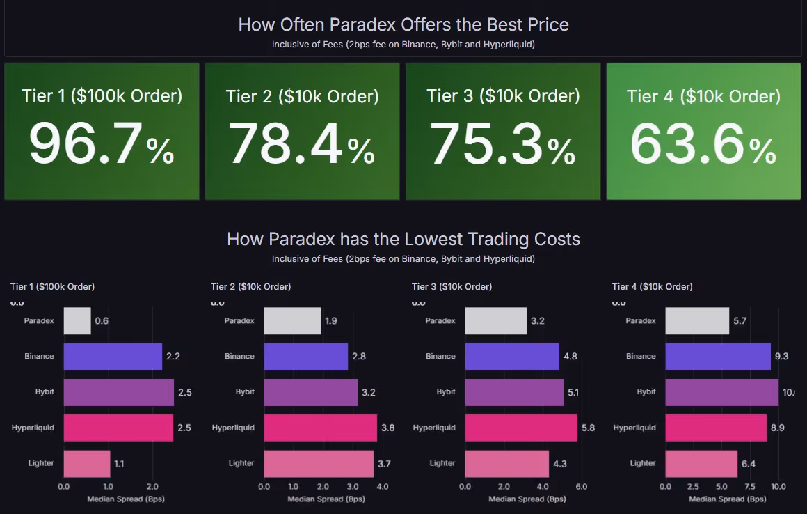 No. RPI reduces toxicity, which lets makers quote tighter spreads with more size. In fact, after adjusting for fees paid Paradex beats the top exchanges ~96% of the time on majors at $100k orders. Check out the Paradex Liquidity Monitor for real-time spreads and execution quality.